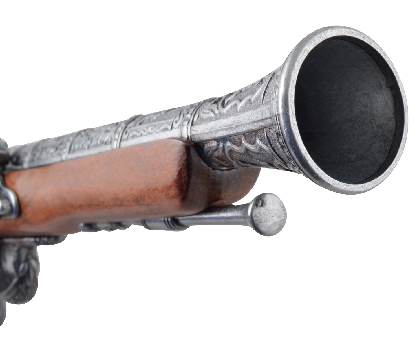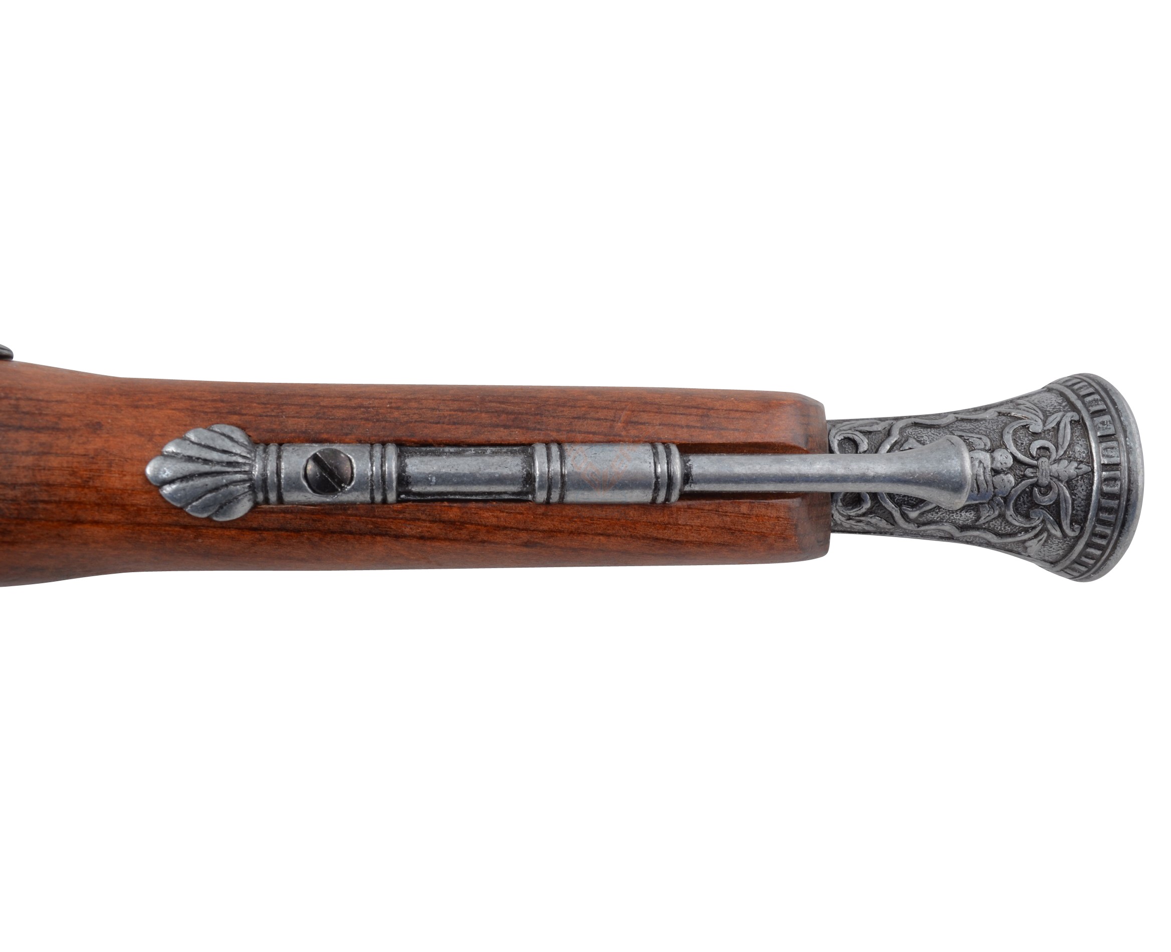 Итальянский пистолет от мастеров сувенирных экземпляров исторического оружия, выглядит чрезвычайно эффектно. Внешний вид такого образца ничем не отличается от оружия, распространенного в 15-18 веках. Для изготовления пистолета использован zamak – сплав на основе алюминия и цинка, а также сталь. Рукоятка и ложе изготовлены из натурального дерева и украшены имитацией гравировки. Ствол пистолета имеет расширенную в сторону дула форму, под столом – имитация шомпола, необходимого для регулярной чистки оружия и его зарядки. Рукоять украшает устрашающая маска с кольцом, которое, видимо, предназначалось для закрепления оружия на поясном ремне. Габариты и вес пистолета отвечают оригинальным образцам того времени: вес оружия – 0,69 кг, длина – 39 см. Ударный механизм и спусковой крючок подвижны, это делает пистолет еще более аутентичным.