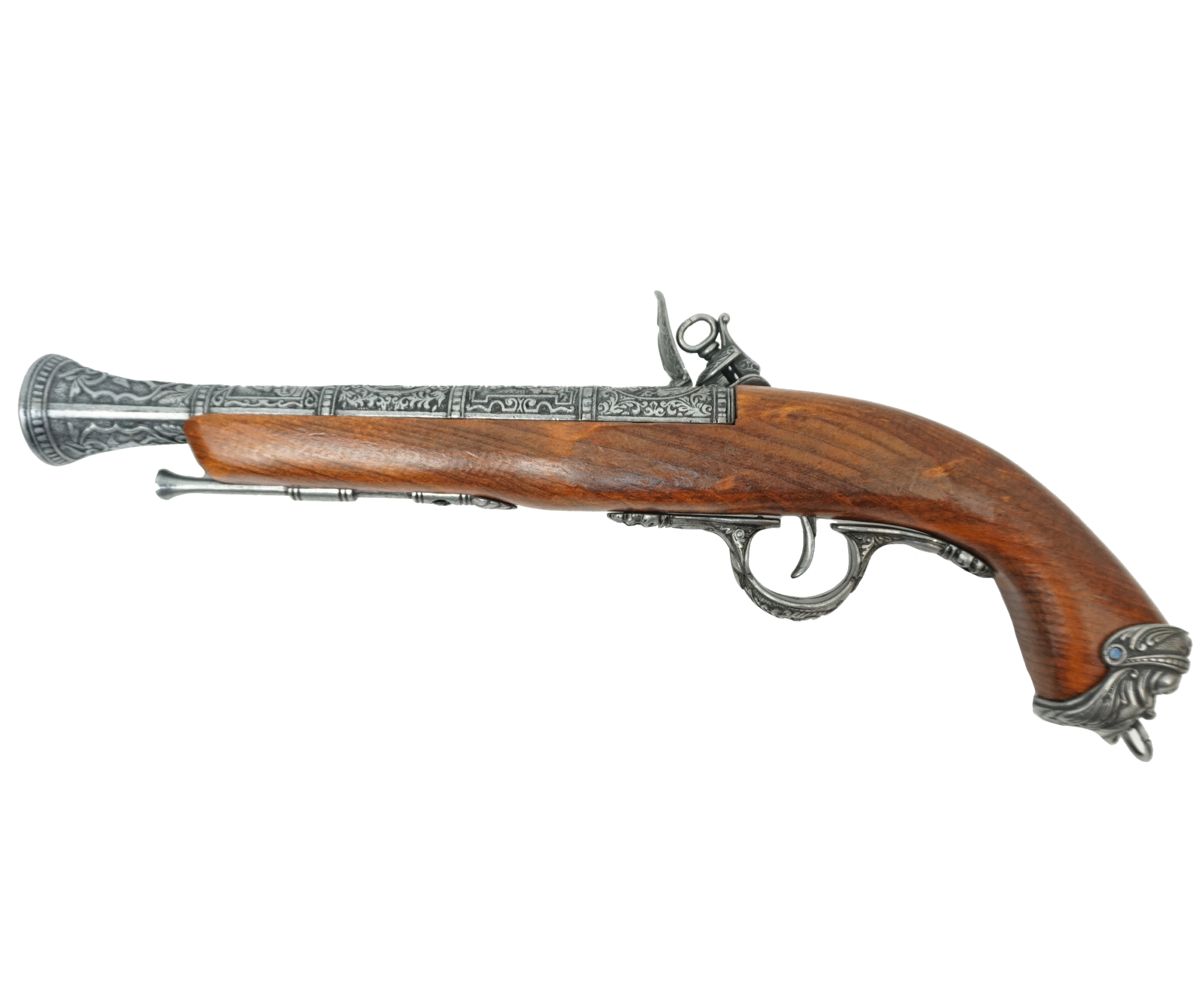 Макет итальянский пистолет – это прекрасная копия красивого оружия, использовавшегося на протяжении 15-18 веков. Пистоли, как их чаще называли в Италии, выпускались как для самообороны, так и в качестве дуэльного оружия. Золотой век пиратства пришелся на первую треть 18 столетия, и укороченные капсюльные пистолеты активно использовались этими морскими искателями приключений и легкой наживы.