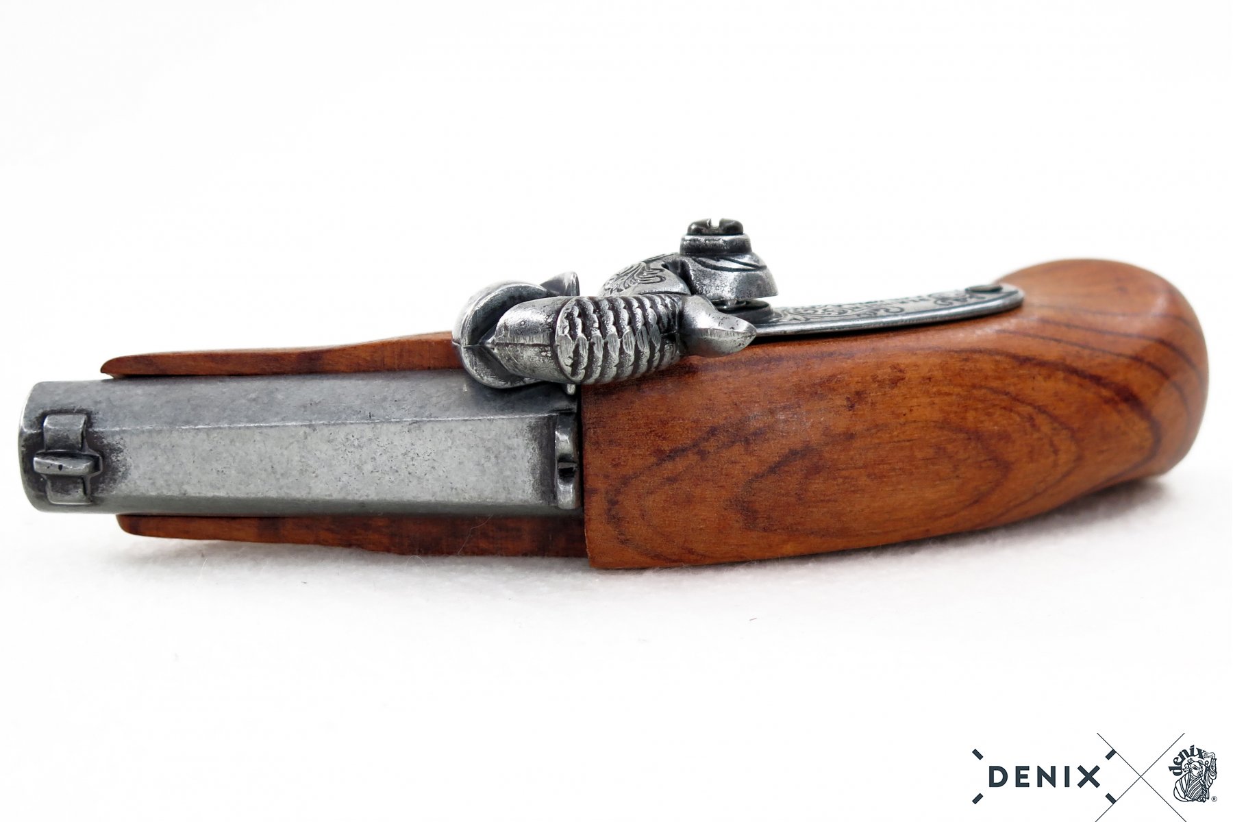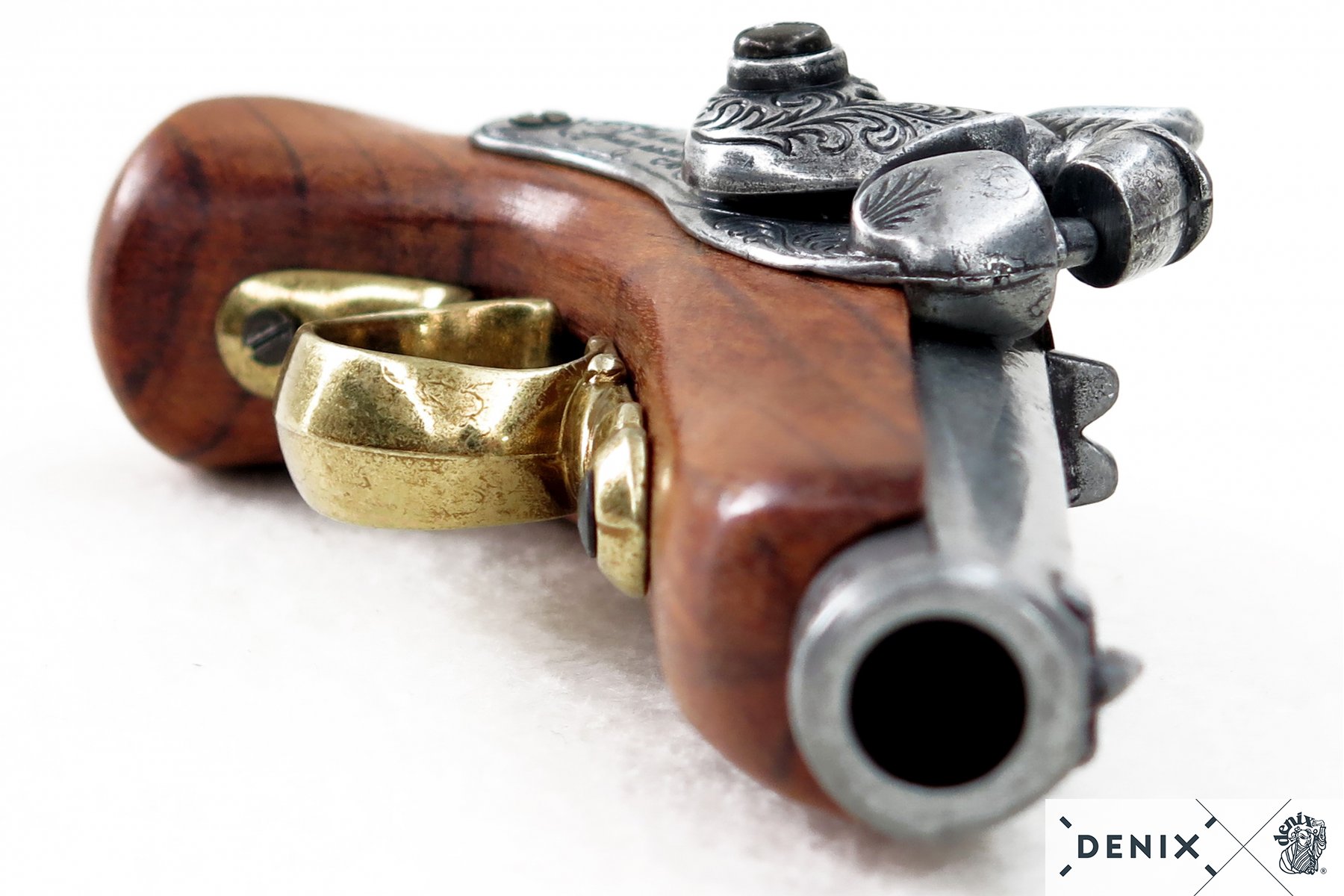 Макет пистоль Дерринджера (США, 1850 г.) DE-1018 – это декоративно-сувенирная версия исторического оружия 19 века, разработка испанского бренда. Изделие в точности копирует по внешнему виду миниатюрный однозарядный пистоль. Ударный механизм и спусковой крючок подвижные. Такое оружие было предназначено для самообороны, и легко помещалось в кармане одежды.