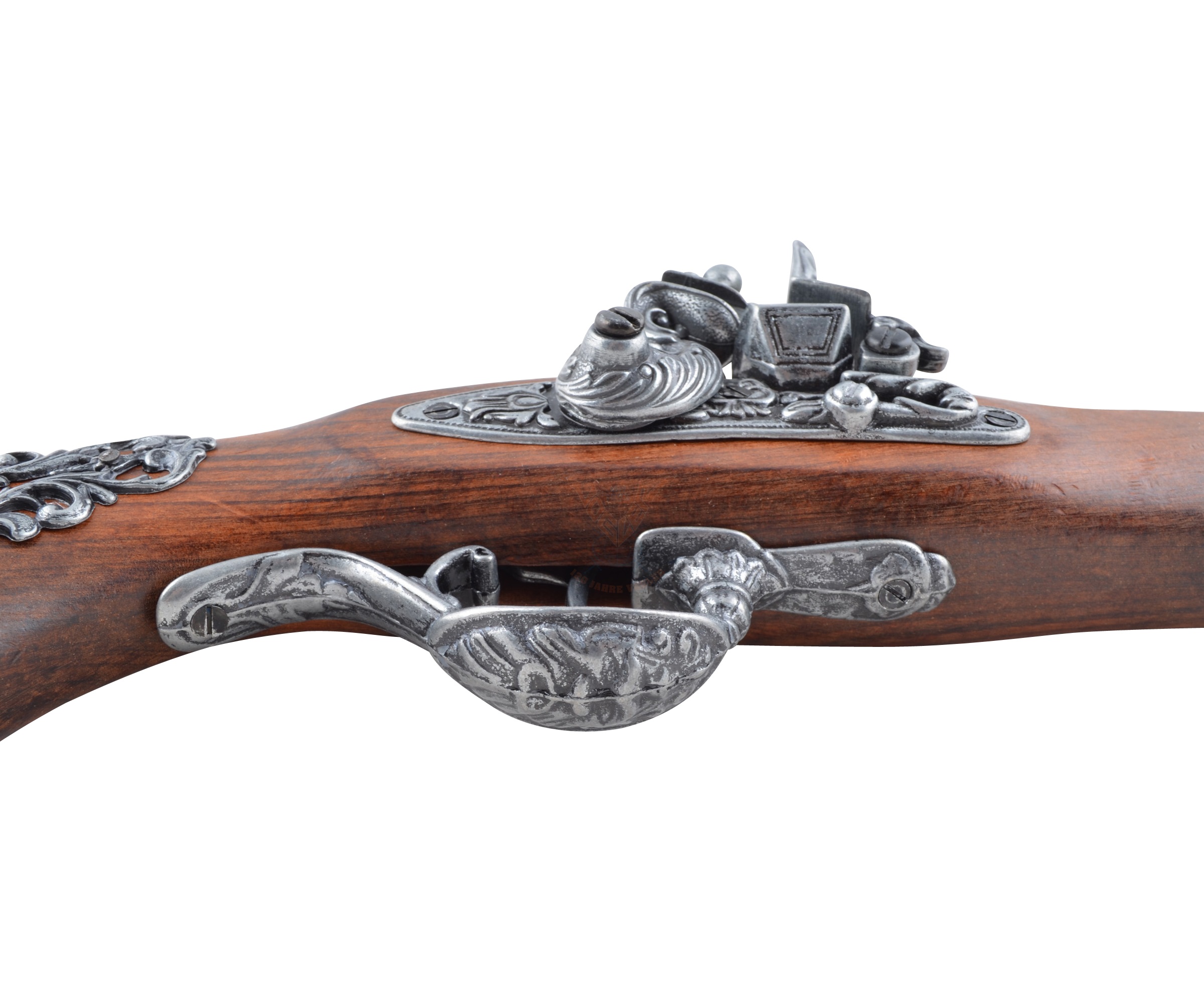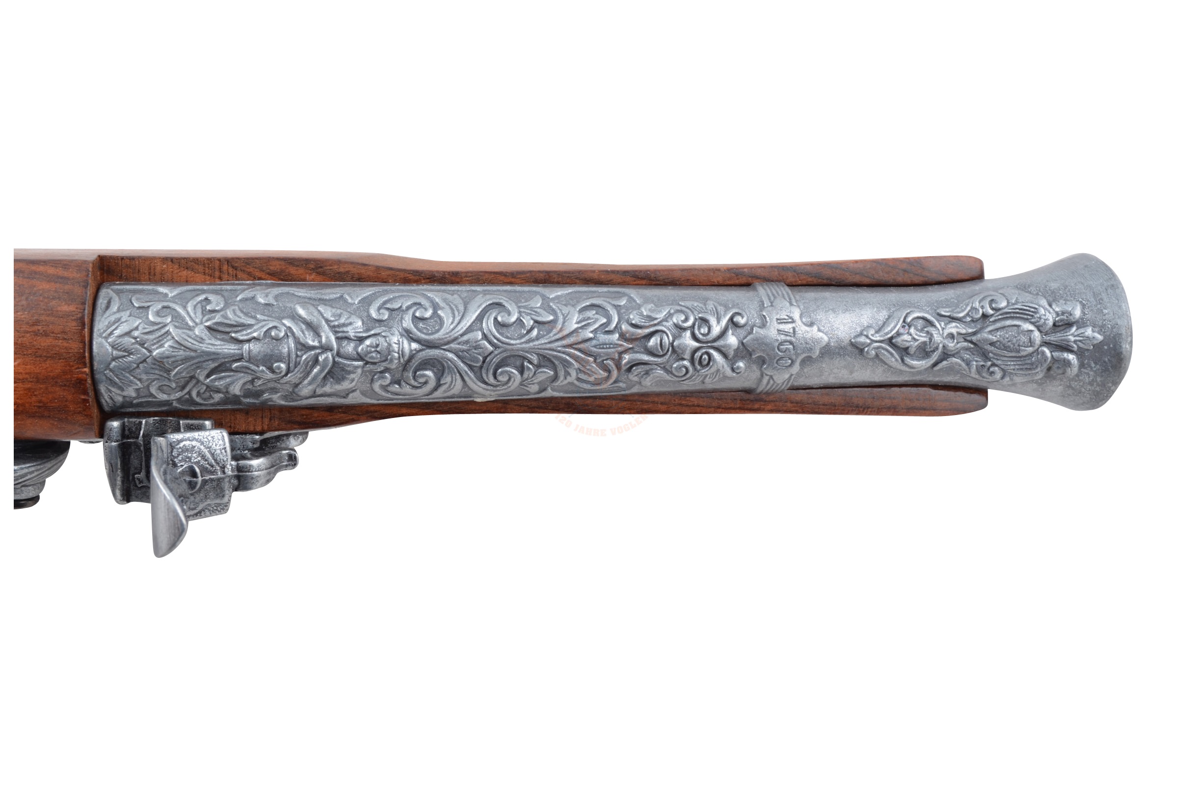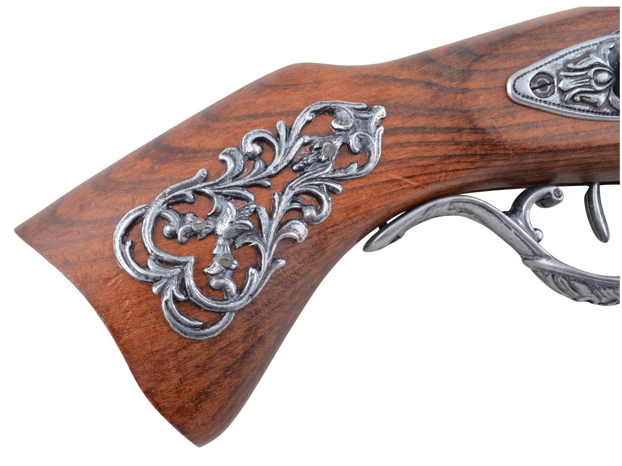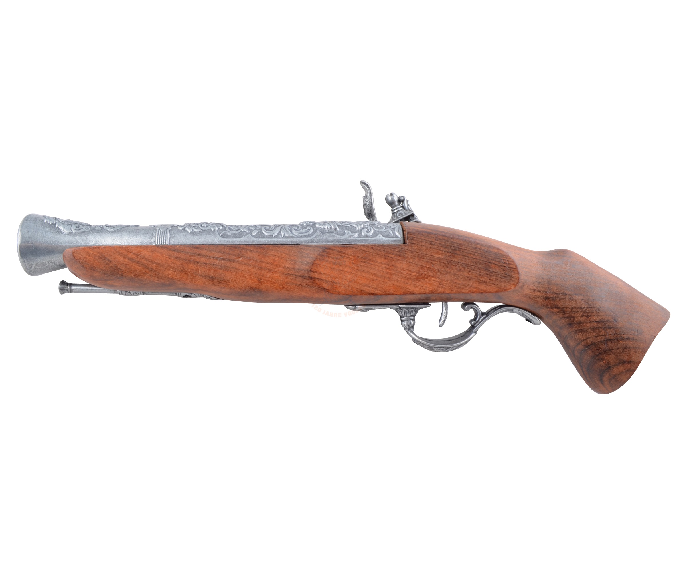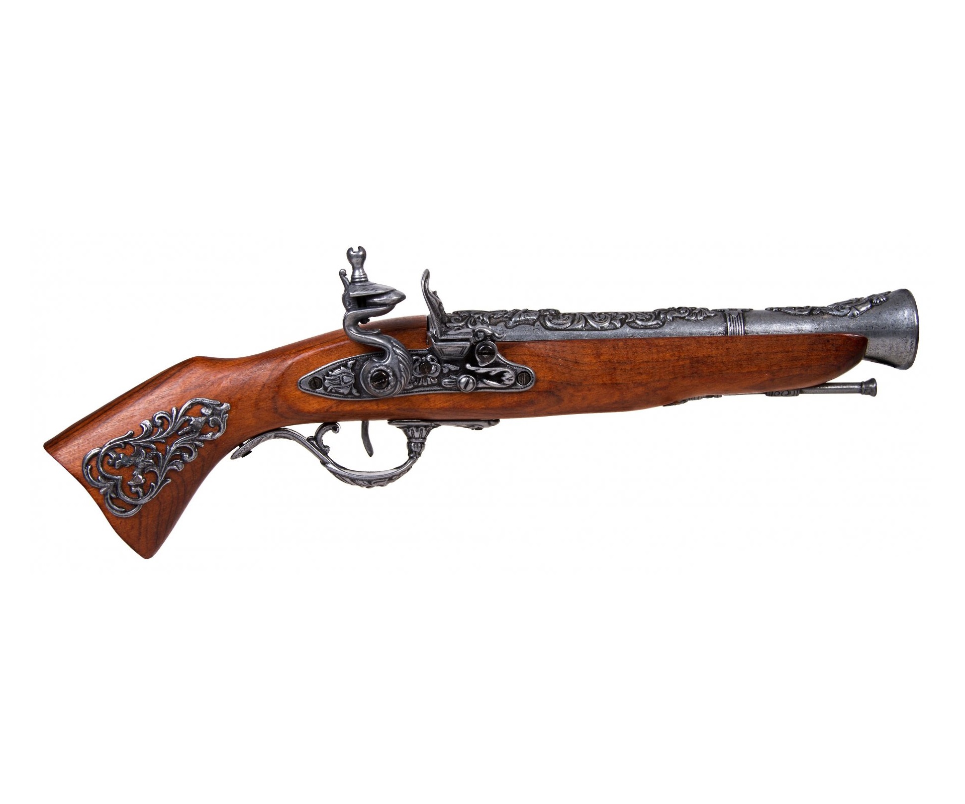 Изделие имеет красивый, очень эффектный внешний вид, украшено гравировками цветочной тематики. Изготовлен пистолет из металла и натурального дерева коричневого цвета. Вес мушкетона – 0,6 кг, длина 39 см.