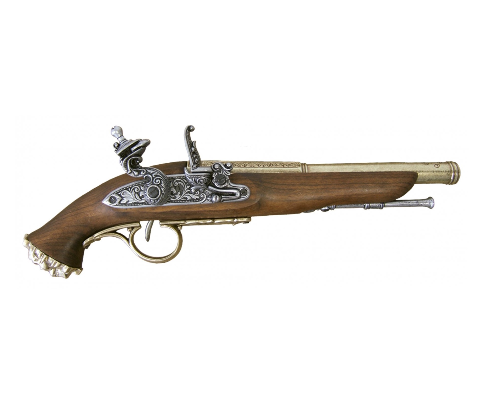 Модель пиратского кремневого пистолета 18 века. Выполнена из металла и дерева. Имитирует механизм заряжания и стрельбы.
